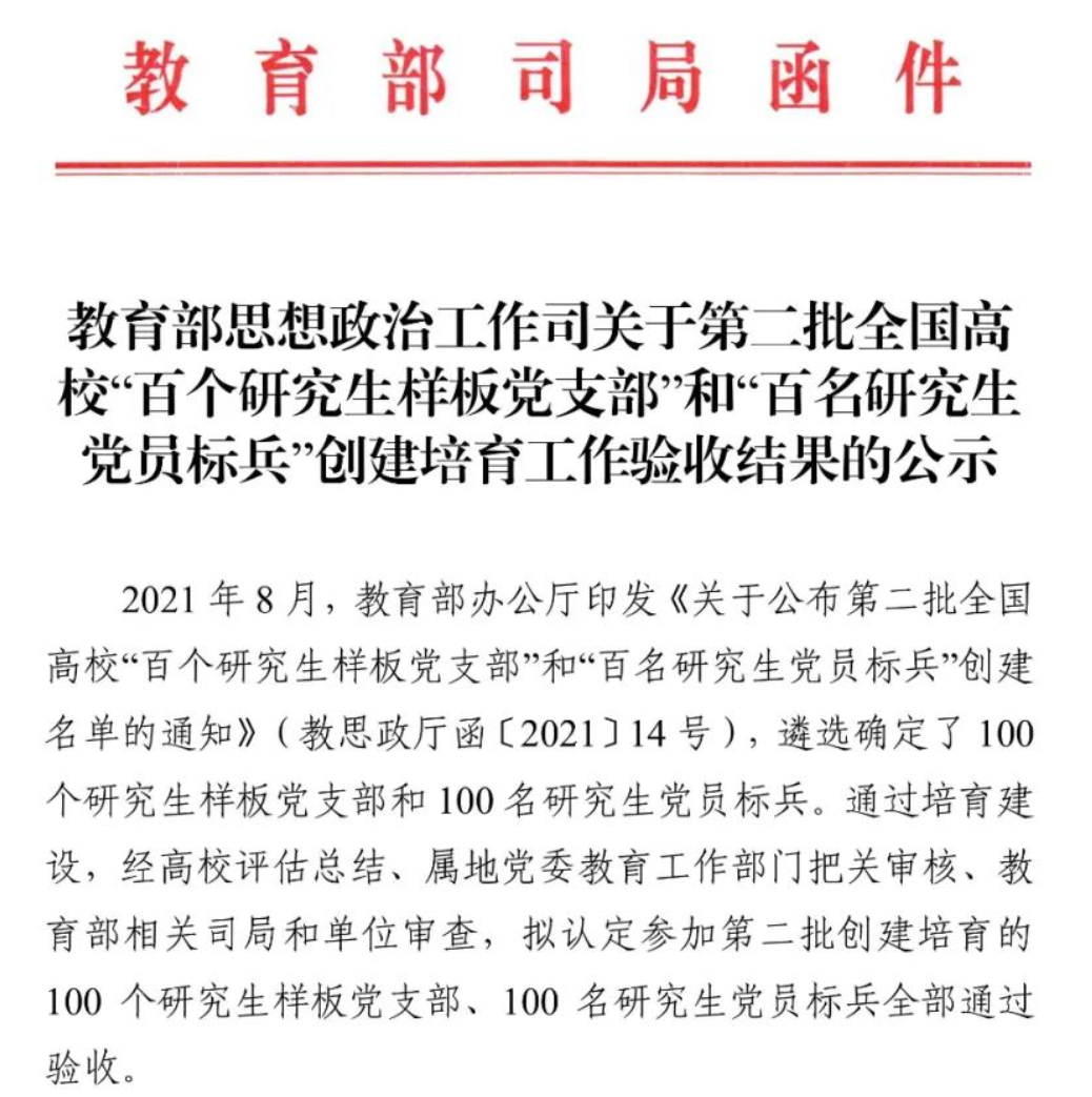 近日,教育部思想政治工作司发布了关于第二批全国高校“百个研究生样板党支部”和“百名研究生党员标兵”创建培育工作验收结果的公示,6165cc金沙总站检测中心博士学生党支部作为“百个研究生样板党支部”通过验收。