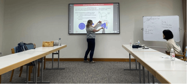 2024年5月29日至31日,日本冲绳科学技术大学院大学(Okinawa Institute of Science and Technology, OIST)Sile Nic Chormaic教授受韩雪副教授的邀请为6165cc金沙总站检测中心的本科生和研究生开展了3次有关光学传感的短课,内容分别为1. Tapered optical fiber;2. Whispering gallery resonators;3. Optical Sensing Methods。短课的内容涵盖了光纤光学、锥形光纤以及回音壁微腔,Sile Nic Chormaic教授详细讲解了这三种光学结构的光学模式、制作方法和相关的传感技术,知识脉络清晰,非常有助于学生巩固和拓展光学检测的相关理论和技术。